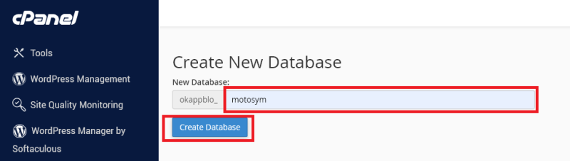 2.Tạo một database mới băng cách đặt tên cho database (ví dụ: okappblo_motosym), rồi bấm chọn “Create Database”