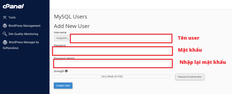 3.Kéo trang xuống dưới tạo một user mới và đặt mật khẩu rồi bấm chọn “Create User”