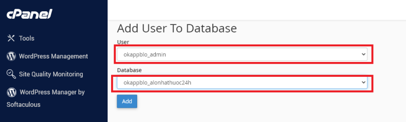 4.Gán user vừa tạo ở bước trên vào database vừa tạo rồi bấm chọn “Add”