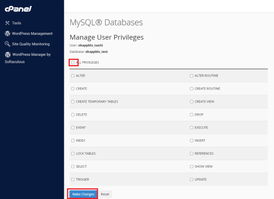 5. cấp quyền All Privileges.( tất cả quyền trong database cho user) rồi chọn ” Make Changes”