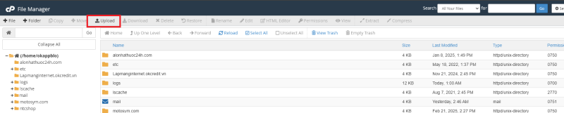 1. Dùng FTP Client (FileZilla) hoặc File Manager trong cPanel.