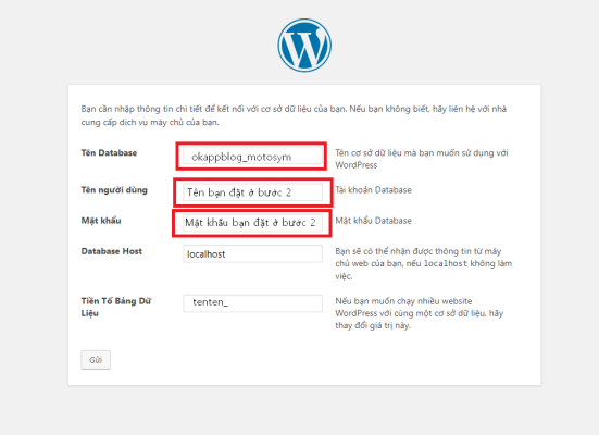 3. Tiếp theo các bạn cần điền các thông tin Tên Database, Tên người dùng tài khoản Database, Mật khẩu Database đã tạo ở Phần 3 trong bước 2: MySQL user. Đối với Tiền Tố Bảng Dữ Liệu các bạn có thể thay đổi theo ý muốn