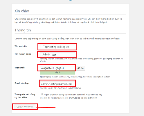 5. Sau khi bấm vào Bắt đầu cài đặt các bạn sẽ được chuyển tới trang điền các thông tin cần thiết như Tên website, Tên người dùng và Mật khẩu đăng nhập wp-admin. Sau khi điền xong các bạn nhớ lưu lại Tên người dùng và Mật khẩu, đây sẽ là thông tin để đăng nhập vào trang quản trị website