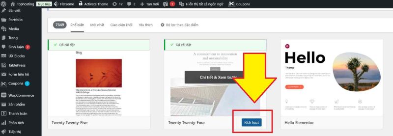 - Nhấp vào Cài đặt, sau đó chọn Kích hoạt. Sau khi kích hoạt trang web của bạn đã được thay đổi diện mạo theo mặc định của theme rồi.