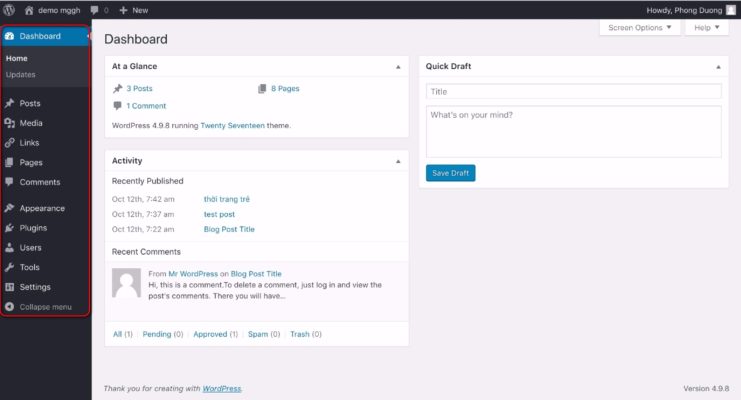Trước khi đến với phần cài đặt giao diện thì bạn nên làm quen với bảng điều khiển trong wordpress.